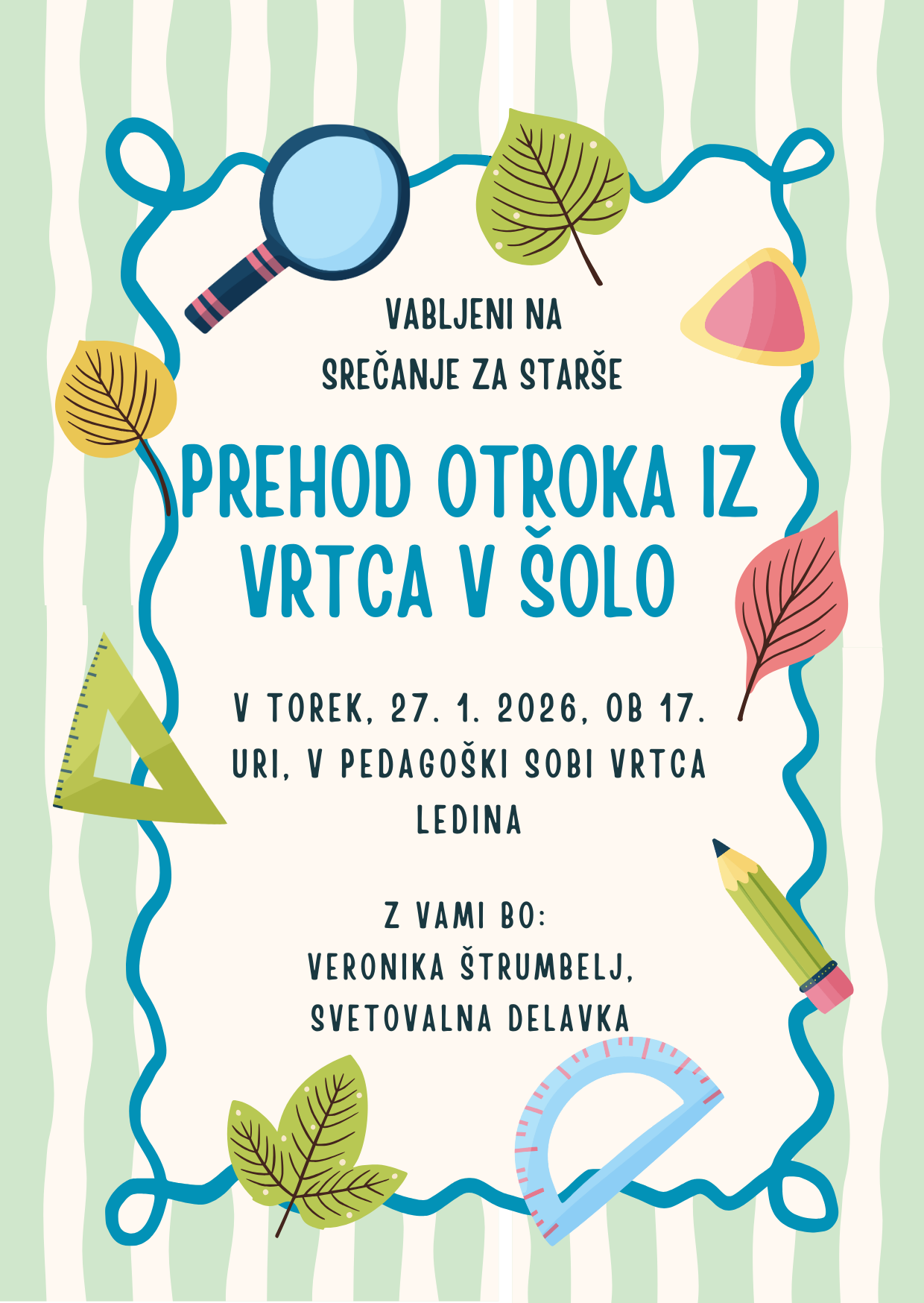 V torek, 27. 1. 2026, vas ob 17. uri vabimo na srečanje za starše z naslovom Prehod otroka iz vrtca v šolo. Srečanje bo potekalo v pedagoški sobi Vrtca Ledina (v kleti).